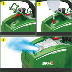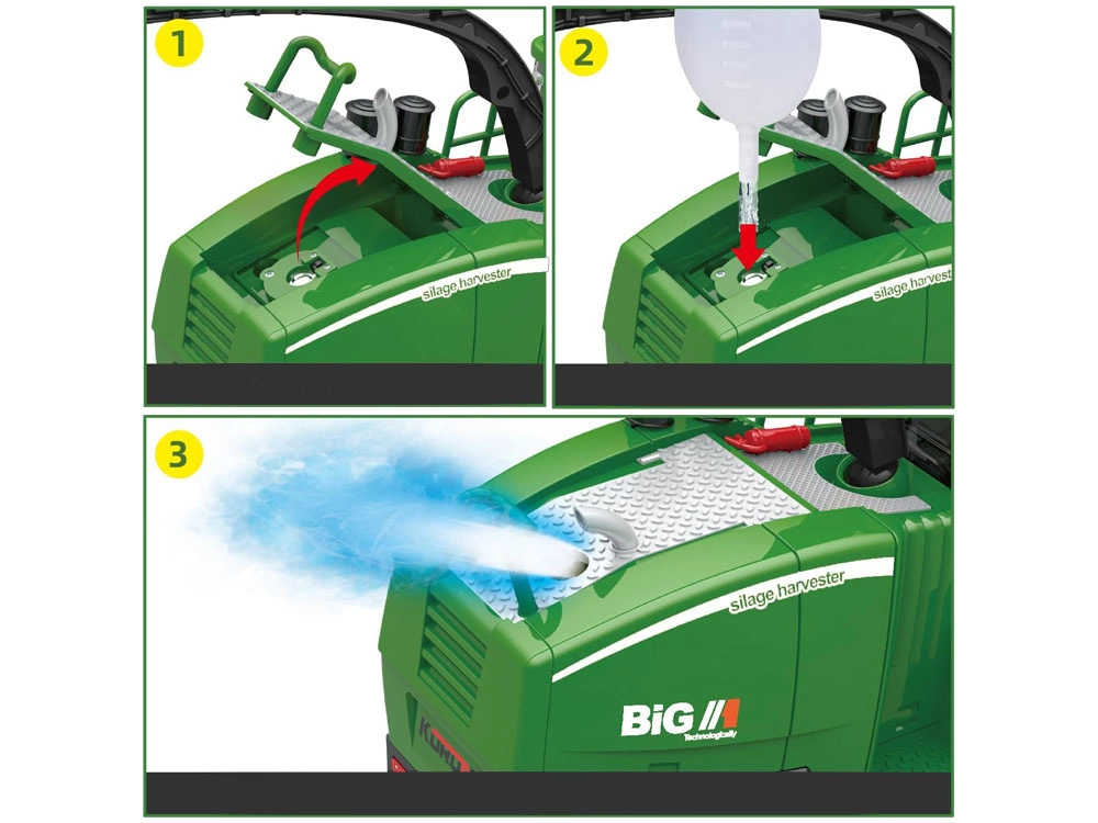 Η μεγαλύτερη ατραξιόν είναι η ρεαλιστική λειτουργία καπνού – απλώς γεμίστε νερό από το παρεχόμενο μπουκαλάκι, ενεργοποιήστε τον καπνό από το τηλεχειριστήριο και από την εξάτμιση βγαίνει απαλή ατμίδα με υποφωτισμό. Ο κινούμενος κοπτικός προσαρμογέας διαθέτει περιστρεφόμενο αναβατήρα, ανύψωση και χαμήλωμα, ενώ ο βραχίονας εκφόρτωσης περιστρέφεται κατά 360°. Ο πίσω άξονας είναι κινητήριος και επιτρέπει ρύθμιση σύγκλισης. Τα φαρδιά λαστιχένια ελαστικά εξασφαλίζουν σταθερότητα και πρόσφυση.