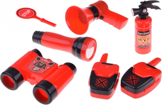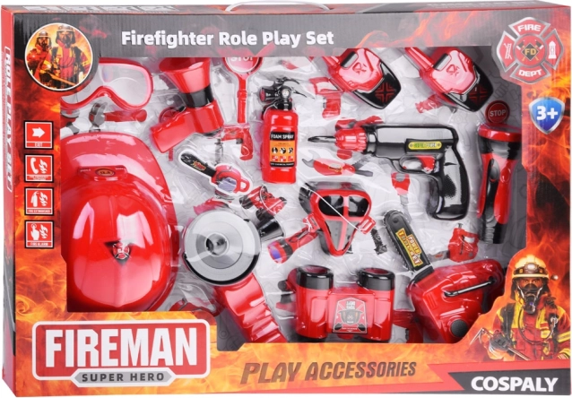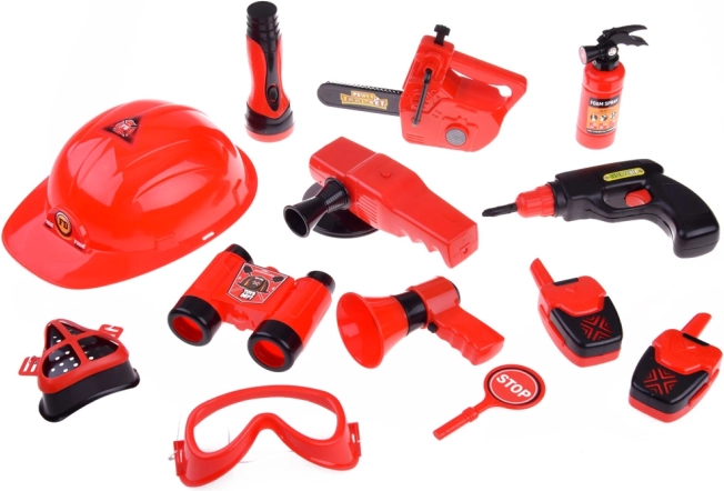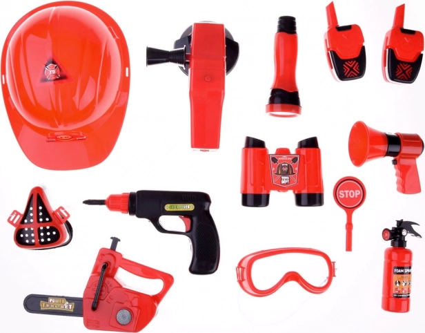 Το σετ περιλαμβάνει όλα τα απαραίτητα για παιχνίδι πυροσβέστη: κράνος, κιάλια, μεγαφωνική συσκευή, μάσκα και άλλα αξεσουάρ ασφαλείας.