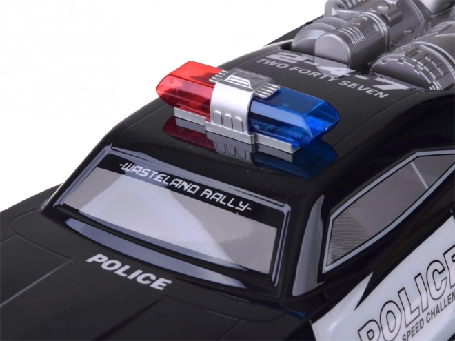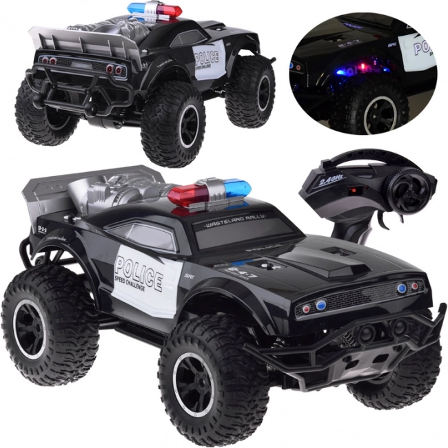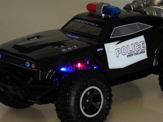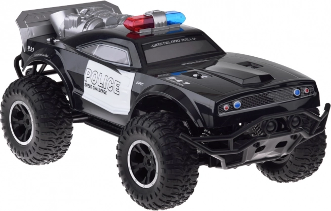 Αυτό το μεγάλο monster truck είναι κατασκευασμένο από εύκαμπτο πλαστικό, κάτι που του χαρίζει χαμηλό βάρος. Οι μεγάλες λαστιχένιες ρόδες με αμορτισέρ εξασφαλίζουν εξαιρετική πρόσφυση στο έδαφος και εύκολο χειρισμό στις στροφές. Το όχημα διαθέτει ρυθμιζόμενη σύγκλιση τροχών, συμβάλλοντας σε καλύτερο έλεγχο. Η πραγματική ατραξιόν είναι ο κόκκινος-μπλε αναβοσβήνων φωτισμός, που μιμείται τα αστυνομικά σήματα και φωτίζει στο σκοτάδι, προσφέροντας ρεαλιστική εμπειρία.