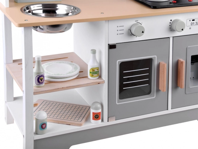 Η ξύλινη διαδραστική κουζίνα είναι το ιδανικό εργαλείο για την ανάπτυξη της δημιουργικότητας και των κινητικών δεξιοτήτων των παιδιών σας. Αυτό το παιδικό σετ μιμείται τις καθημερινές δραστηριότητες, ενθαρρύνει το φανταστικό παιχνίδι και είναι κατασκευασμένο εξ ολοκλήρου από φυσικό ξύλο, διασφαλίζοντας ασφάλεια και αντοχή.