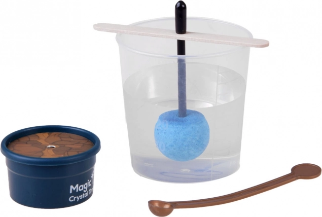 Στο σετ θα βρείτε όσα χρειάζονται: ογκομετρικό κύλινδρο 200 ml, σακουλάκι με κρυσταλλική σκόνη/άμμο, χρωματιστό κρυσταλλικό σπόρο σε ραβδάκι, αναδευτήρα, μεγεθυντικό φακό για λεπτομερή παρατήρηση, ξύλινη πλακέτα, στοπ και μικρό γλαστράκι (βάση). Η διαδικασία είναι απλή και ασφαλής· αρκεί να ακολουθήσετε τις οδηγίες και να εργαστείτε με ζεστό νερό υπό την επίβλεψη ενήλικα.