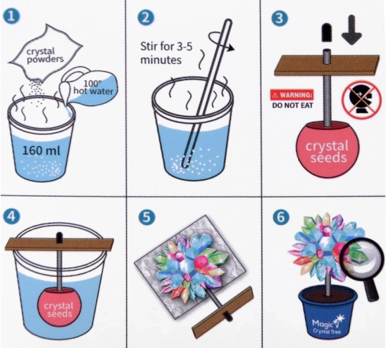 Αυτό το εκπαιδευτικό πείραμα STEM επιτρέπει στα παιδιά να παρακολουθήσουν την πραγματική διαδικασία της κρυστάλλωσης – από την προετοιμασία του διαλύματος έως την ανάπτυξη μιας υπέροχης κρυστάλλινης «κορώνας». Μέσα σε λίγες ημέρες δημιουργείται ένα πρωτότυπο κρυστάλλινο δεντράκι, που γίνεται εντυπωσιακό στολίδι του δωματίου και υπενθύμιση του πρώτου επιστημονικού πειράματος.