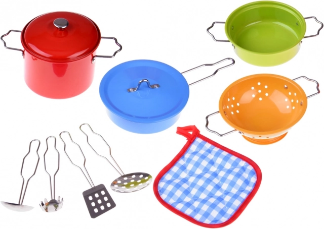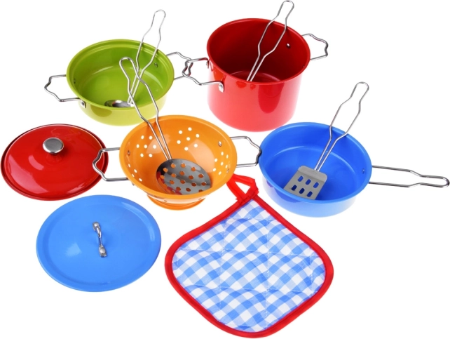 Πολύχρωμο μεταλλικό σετ για μικρούς σεφ που προσφέρει ρεαλιστικό παιχνίδι μαγειρικής. Περιλαμβάνει κατσαρόλες, τηγάνι, σουρωτήρι και εργαλεία και είναι ιδανικό για την ανάπτυξη της φαντασίας, της λεπτής κινητικότητας και των παιχνιδιών ρόλων στη παιδική κουζίνα.