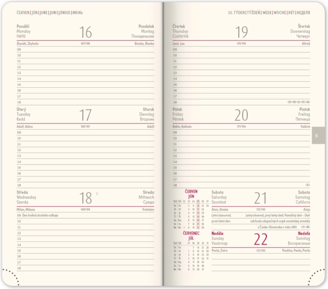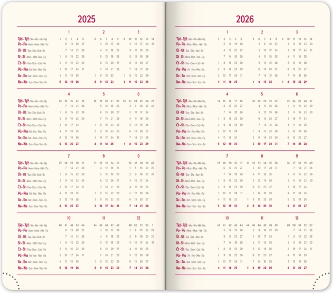 Το κομψό τσέπης ημερολόγιο Diamante 2025 σε κόκκινο χρώμα προσφέρει πρακτική εβδομαδιαία διάταξη με τσεχο‑σλοβακικό ημερολόγιο και πρόσθετες γλώσσες. Ιδανικό για τον καθημερινό προγραμματισμό εν κινήσει – συμπαγής μορφή, ποιοτική κατασκευή και χρήσιμες επισκοπήσεις. Μηνιαίοι και ετήσιοι προγραμματιστές, χάρτες Τσεχικής και Σλοβακικής Δημοκρατίας, υφασμάτινος σελιδοδείκτης και διάτρητες γωνίες διευκολύνουν τον προσανατολισμό και την οργάνωση.