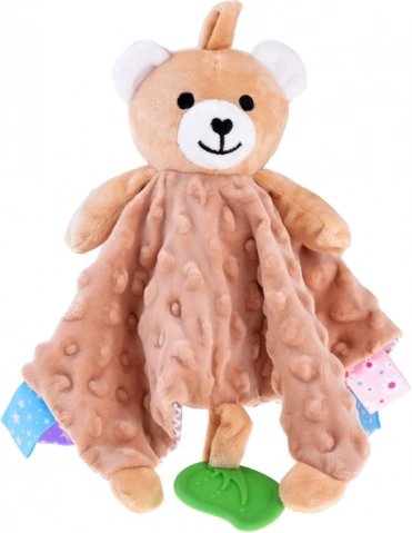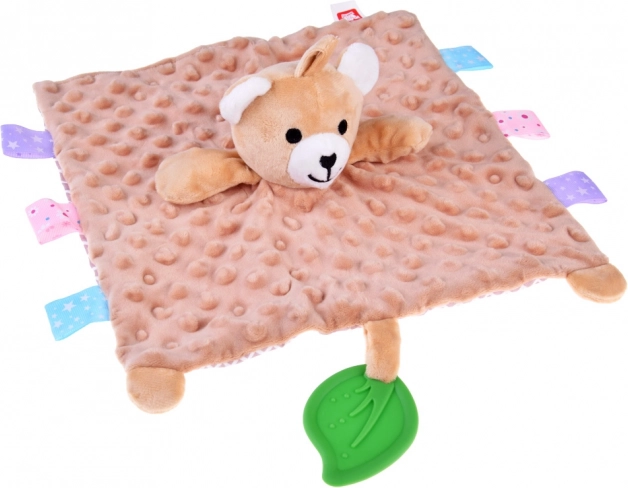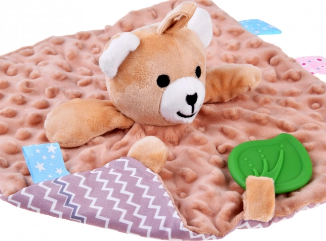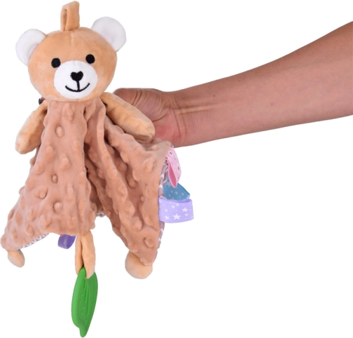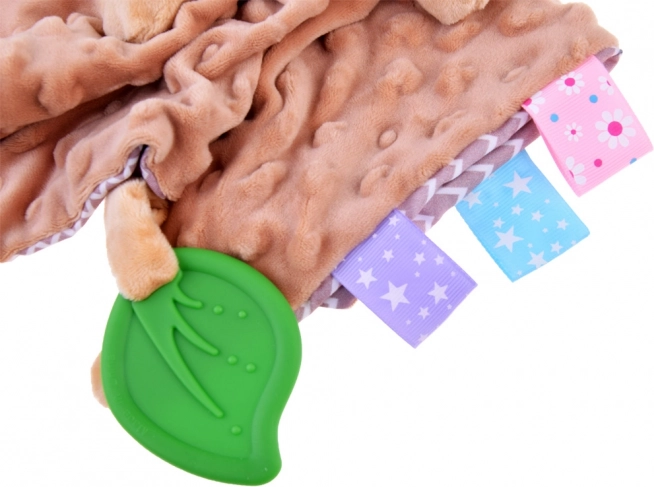 Υφασμάτινο κουκλάκι-κουβερτούλα κουνελάκι με ετικετάκια και μασητικό για μωρά