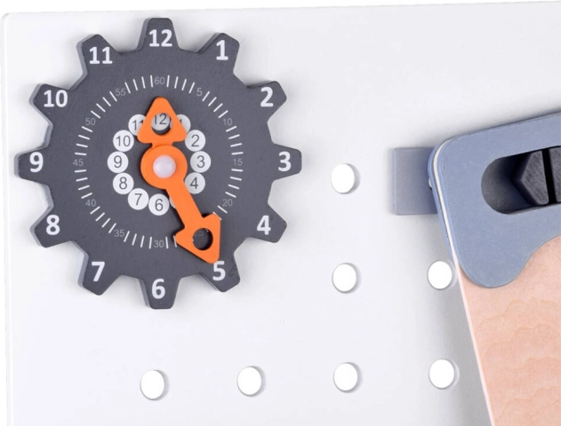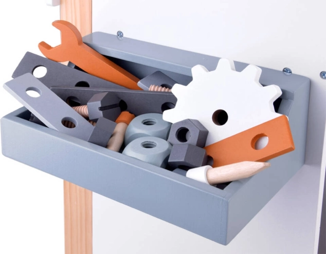 Ο πάγκος διαθέτει χώρους αποθήκευσης και pegboard, που διδάσκουν στα παιδιά πώς να οργανώνουν αποτελεσματικά τα εργαλεία και τα αξεσουάρ τους.