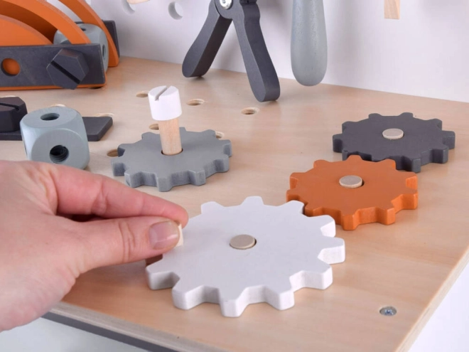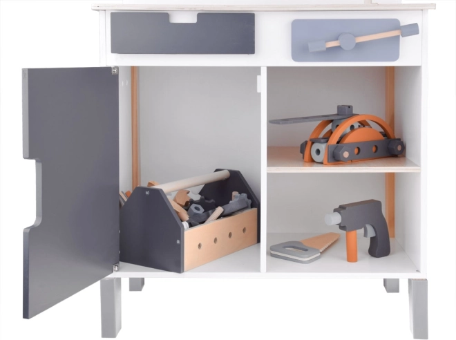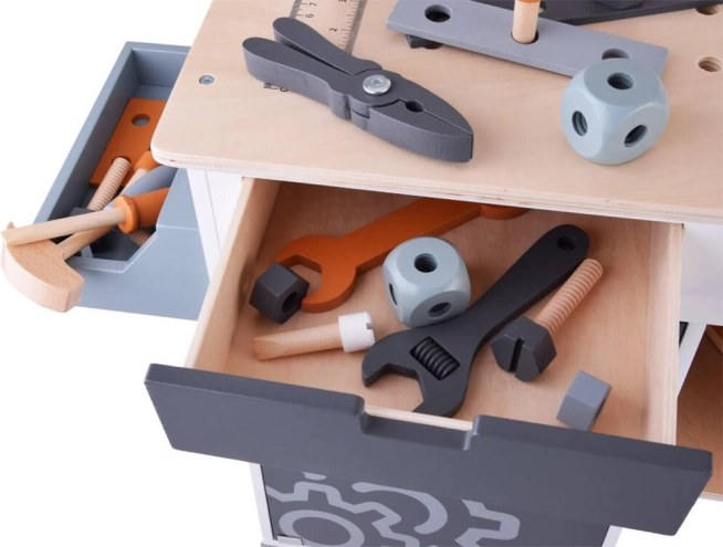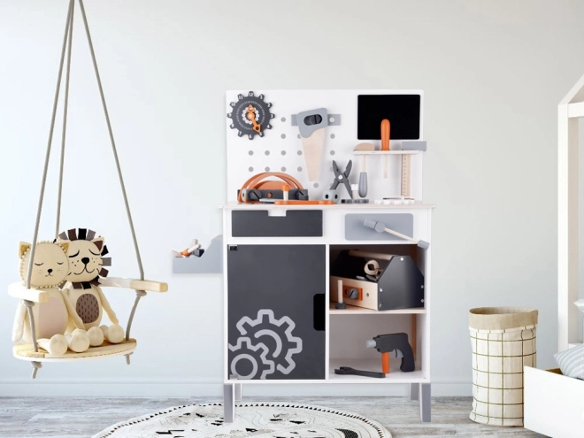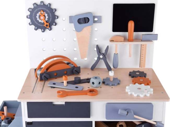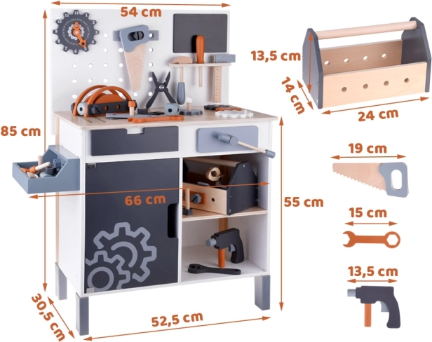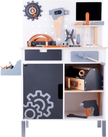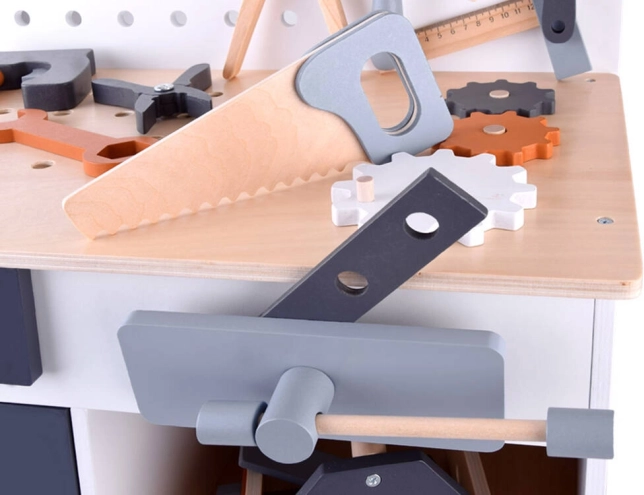Ο ξύλινος πάγκος εργασίας για παιδιά αποτελεί ιδανικό παιχνίδι για την ανάπτυξη της δημιουργικότητας και της λεπτής κινητικότητας. Χάρη στη μεγάλη ποικιλία εργαλείων, όπως πριόνι, σφυρί, κατσαβίδι και πολλά άλλα, τα παιδιά μπορούν να βυθιστούν στον κόσμο των DIY παιχνιδιών και στην προσομοίωση πραγματικού εργασιακού περιβάλλοντος.