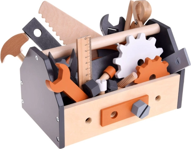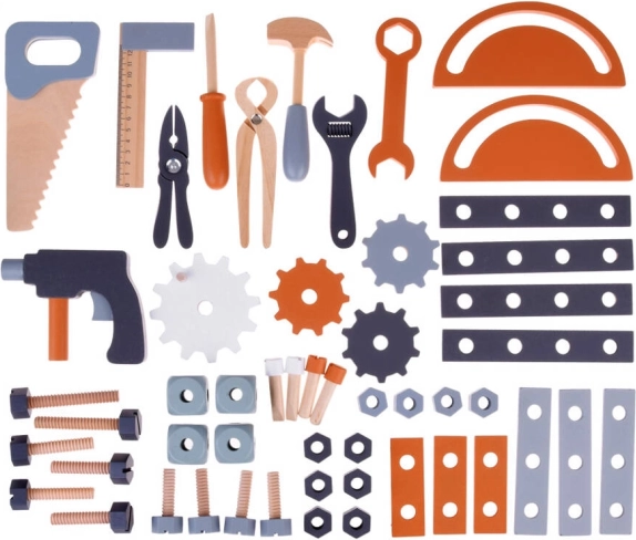 Το σετ περιλαμβάνει μια ευρεία γκάμα εργαλείων, όπως πριόνι, τρυπάνι, σφυρί, κλειδιά, κατσαβίδια και άλλα — ιδανικά για την ανάπτυξη πρακτικών δεξιοτήτων.