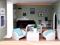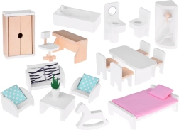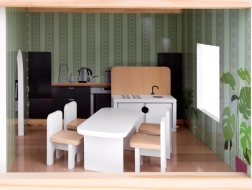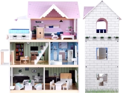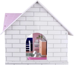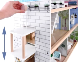 Τα κομψά ξύλινα έπιπλα σε φυσικό και λευκό φινίρισμα ταιριάζουν ιδανικά με τις απαλά επιλεγμένες παστέλ αποχρώσεις του κουκλόσπιτου. Κάθε επίπεδο και κάθε δωμάτιο διαθέτουν γραφικά στους τοίχους, που προσδίδουν θαλπωρή στο εσωτερικό και βοηθούν στην τοποθέτηση των επίπλων.