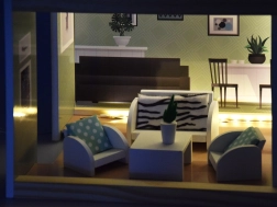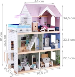 Το κουκλόσπιτο προσφέρει τρία επίπεδα με διαφορετικά δωμάτια, όπως υπνοδωμάτιο, μπάνιο, σαλόνι, κουζίνα και καθιστικό ημέρας.