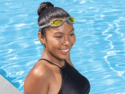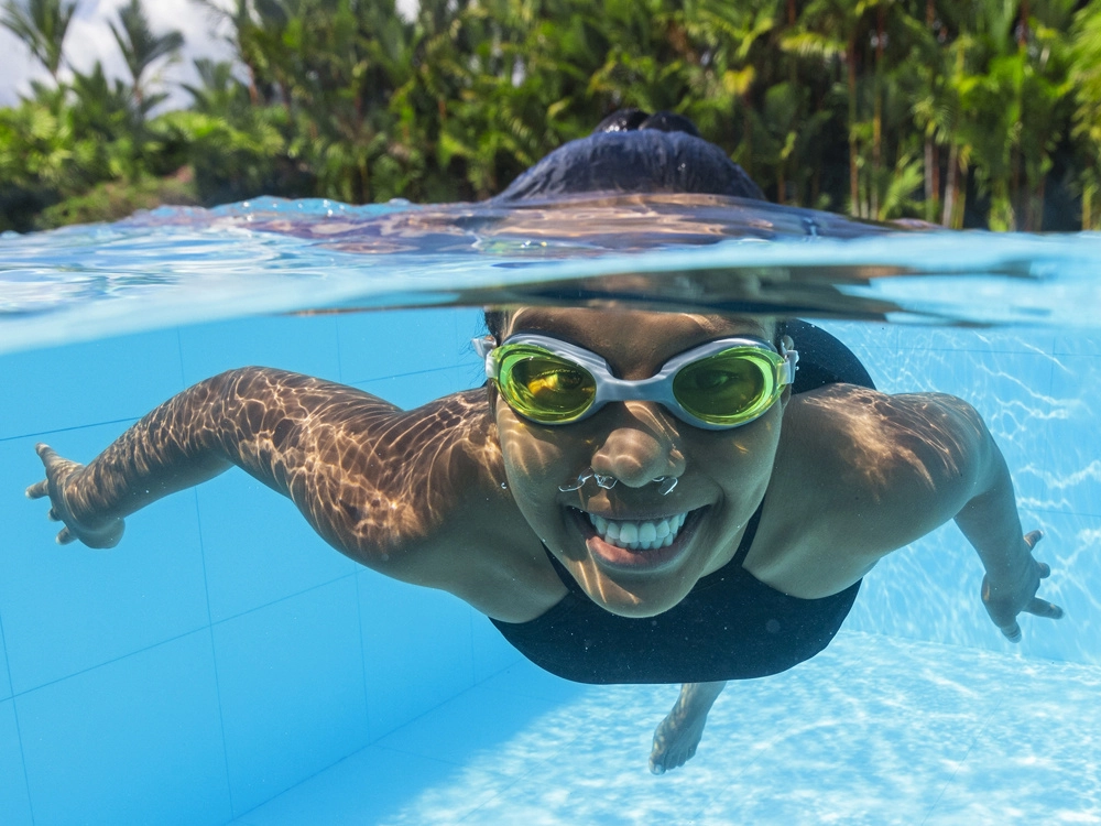 Ανθεκτικοί φακοί πολυκαρβονικού με UV φίλτρο προστατεύουν τα μάτια από τον ήλιο και εξασφαλίζουν καθαρή ορατότητα τόσο σε εξωτερικές όσο και σε εσωτερικές πισίνες.