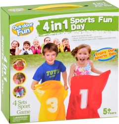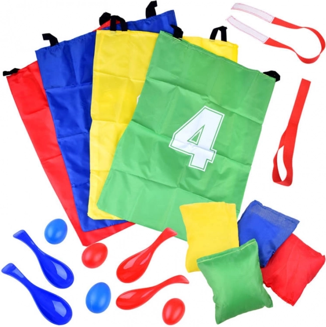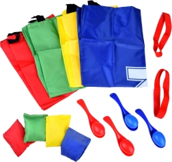 Τέσσερα ανθεκτικά σακιά από νάιλον (66 × 50 cm) με αριθμούς και στιβαρές χειρολαβές είναι ιδανικά για γρήγορους αγώνες και ομαδικούς διαγωνισμούς. Βοηθούν στη φυσική κατάσταση, την ισορροπία και την υγιή κίνηση στον καθαρό αέρα.