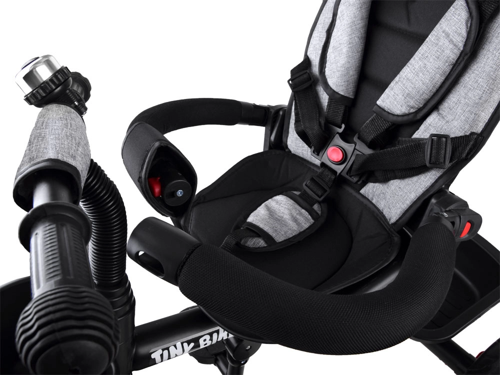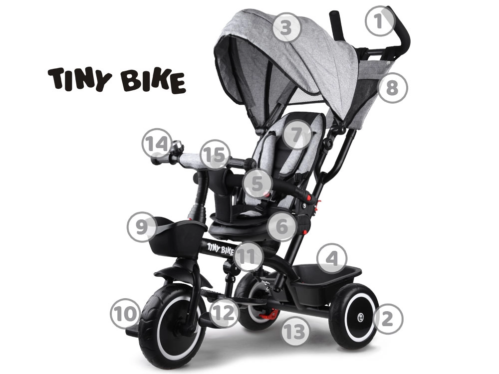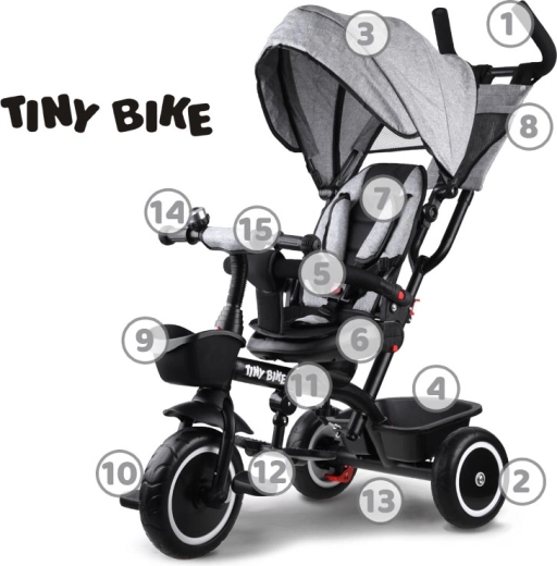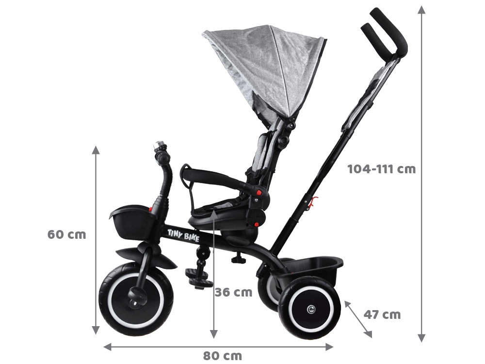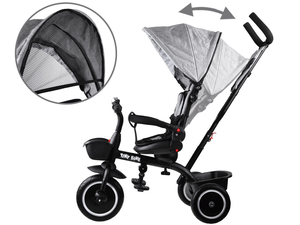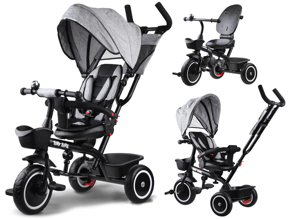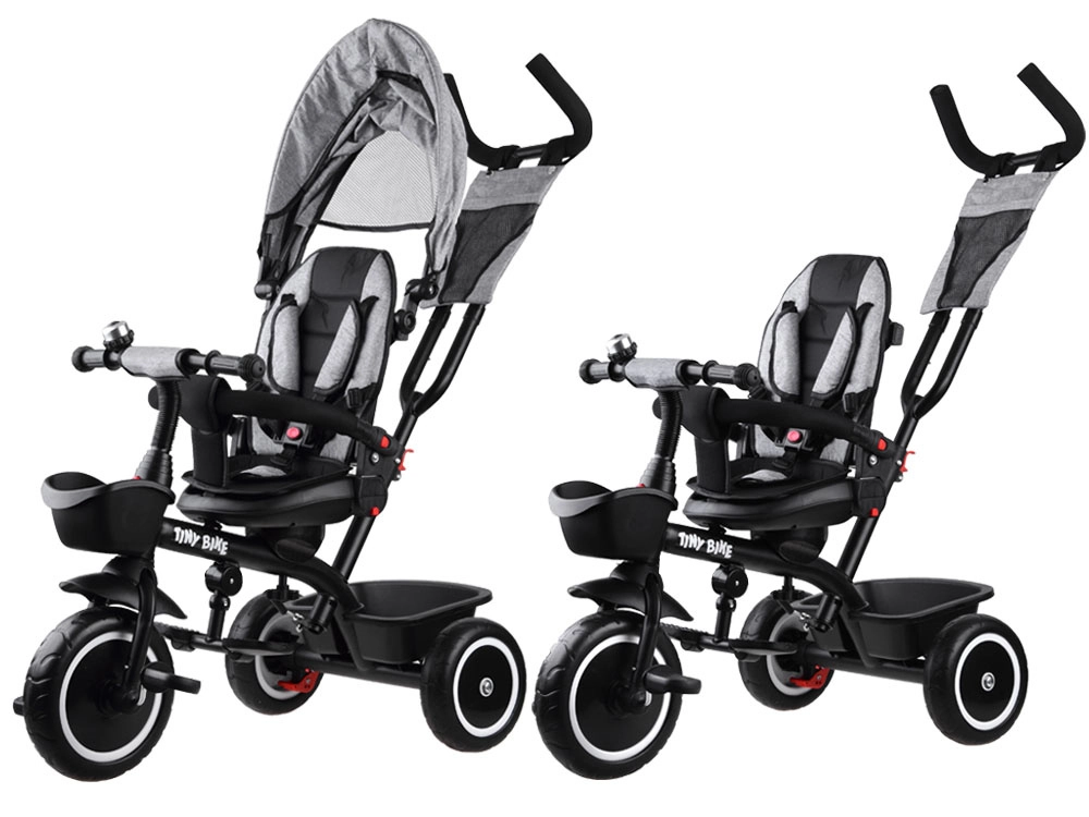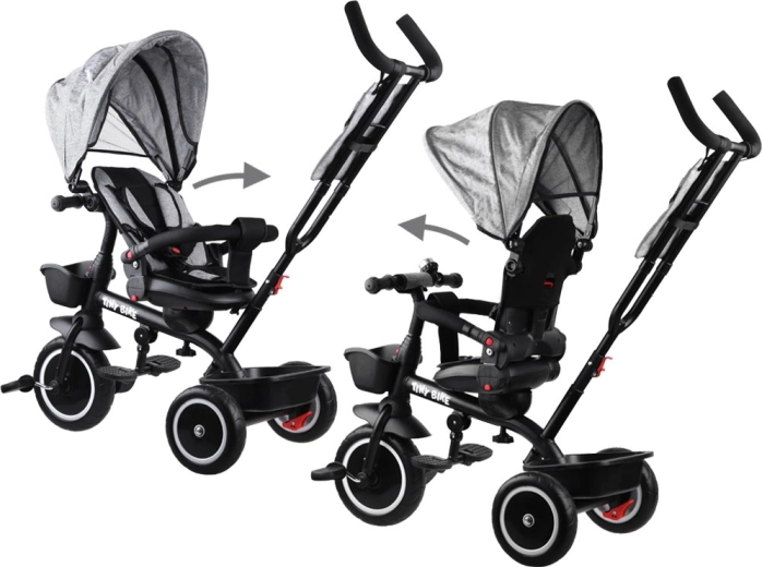 Το πολυλειτουργικό παιδικό τρίκυκλο 3-σε-1 TINY BIKE με περιστρεφόμενο κάθισμα συνδυάζει τη λειτουργία τρίκυκλου με γονική καθοδήγηση, καροτσιού και ανεξάρτητου ποδηλάτου με πετάλια. Προσφέρει ζώνη 5 σημείων, πτυσσόμενη ηλιοσκιάδα με δίχτυ, ανεπίβλεπτα ελαστικά EVA, πίσω φρένα και πλούσιο εξοπλισμό για άνετες και ασφαλείς βόλτες από 6 μηνών έως περίπου 5 ετών.