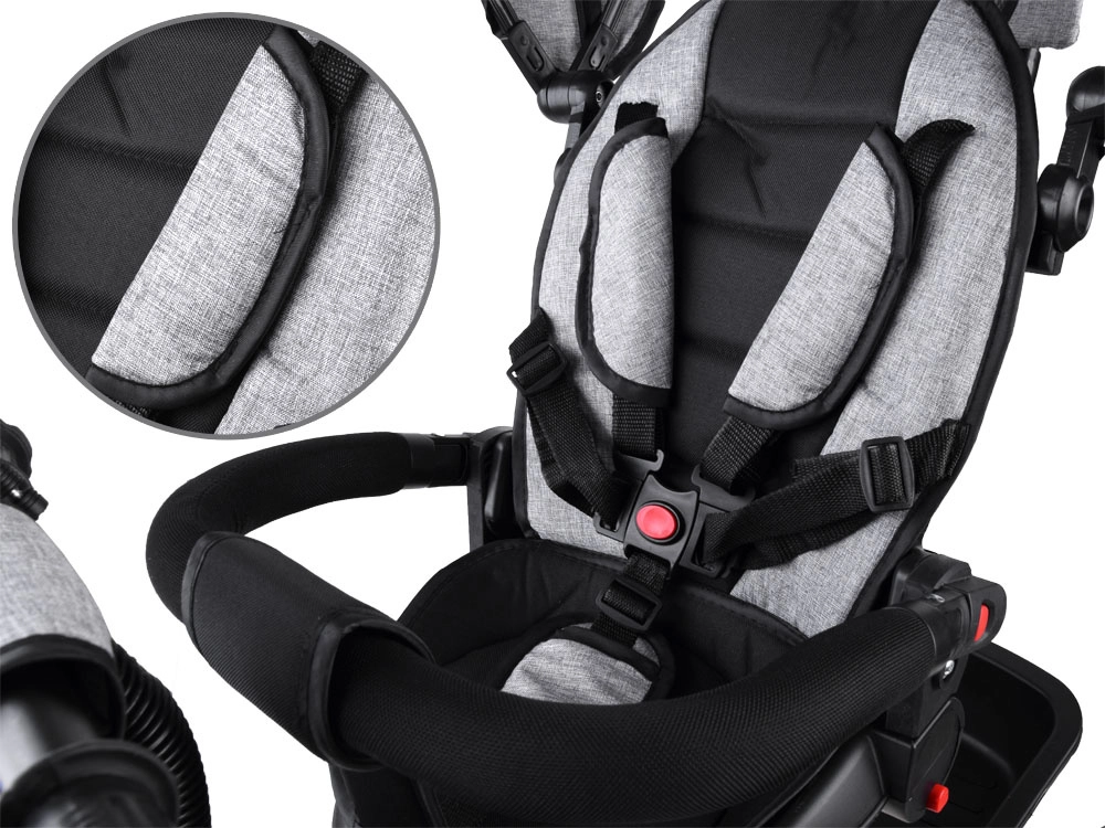 Το τρίκυκλο 3-σε-1 μεγαλώνει μαζί με το παιδί: από τη λειτουργία με γονική καθοδήγηση, στα πρώτα πεταλαρίσματα, έως την αυτόνομη οδήγηση. Το περιστρεφόμενο και ρυθμιζόμενο κάθισμα με μαλακή επένδυση, οι ζώνες ασφαλείας 5 σημείων και η ενισχυμένη μπάρα ασφαλείας προσφέρουν μέγιστη ασφάλεια και άνεση. Η πτυσσόμενη σκίαδα με πίσω δίχτυ αερίζεται και προστατεύει από ήλιο, άνεμο και ελαφριά βροχή.