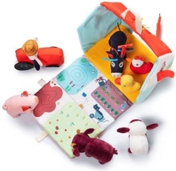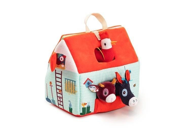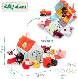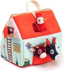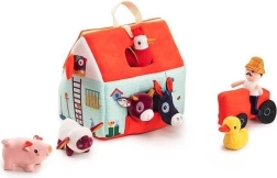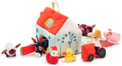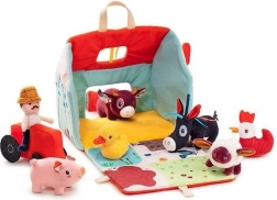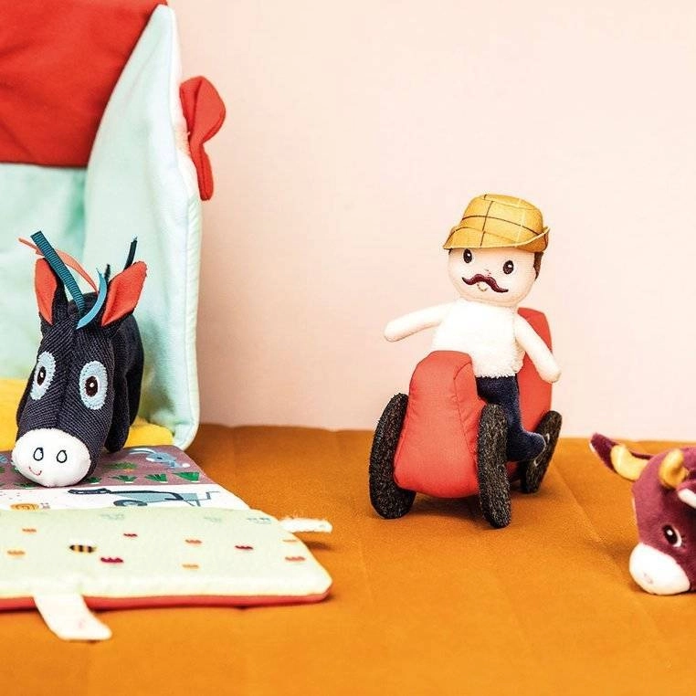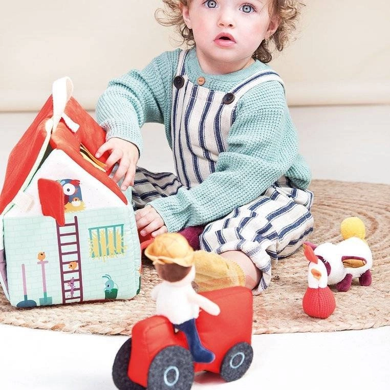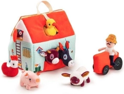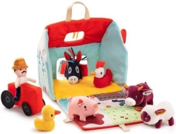 Αυτό το υφασμάτινο σετ μετατρέπει κάθε μέρα σε περιπέτεια στη φάρμα. Το πολύχρωμο σπιτάκι-αποθήκη ανοίγει και γίνεται αγροτικός χώρος με εκτυπώσεις από παρτέρια, βοσκότοπο, λιμνούλα και λασπότοπο για το γουρουνάκι. Περιλαμβάνονται ο γενειοφόρος αγρότης Jeff, κόκκινο τρακτέρ και τα ζωάκια: η αγελαδίτσα Rosalie, το γουρουνάκι Simon, το προβατάκι Yvon, ο πάπιαρος Gaston, η κοτούλα Paulette και ο γαϊδαράκος Ignace. Όλα είναι φτιαγμένα από απαλά υλικά με διαφορετικές υφές για αισθητηριακή διέγερση.