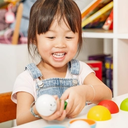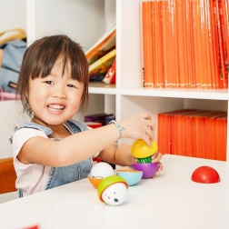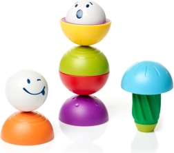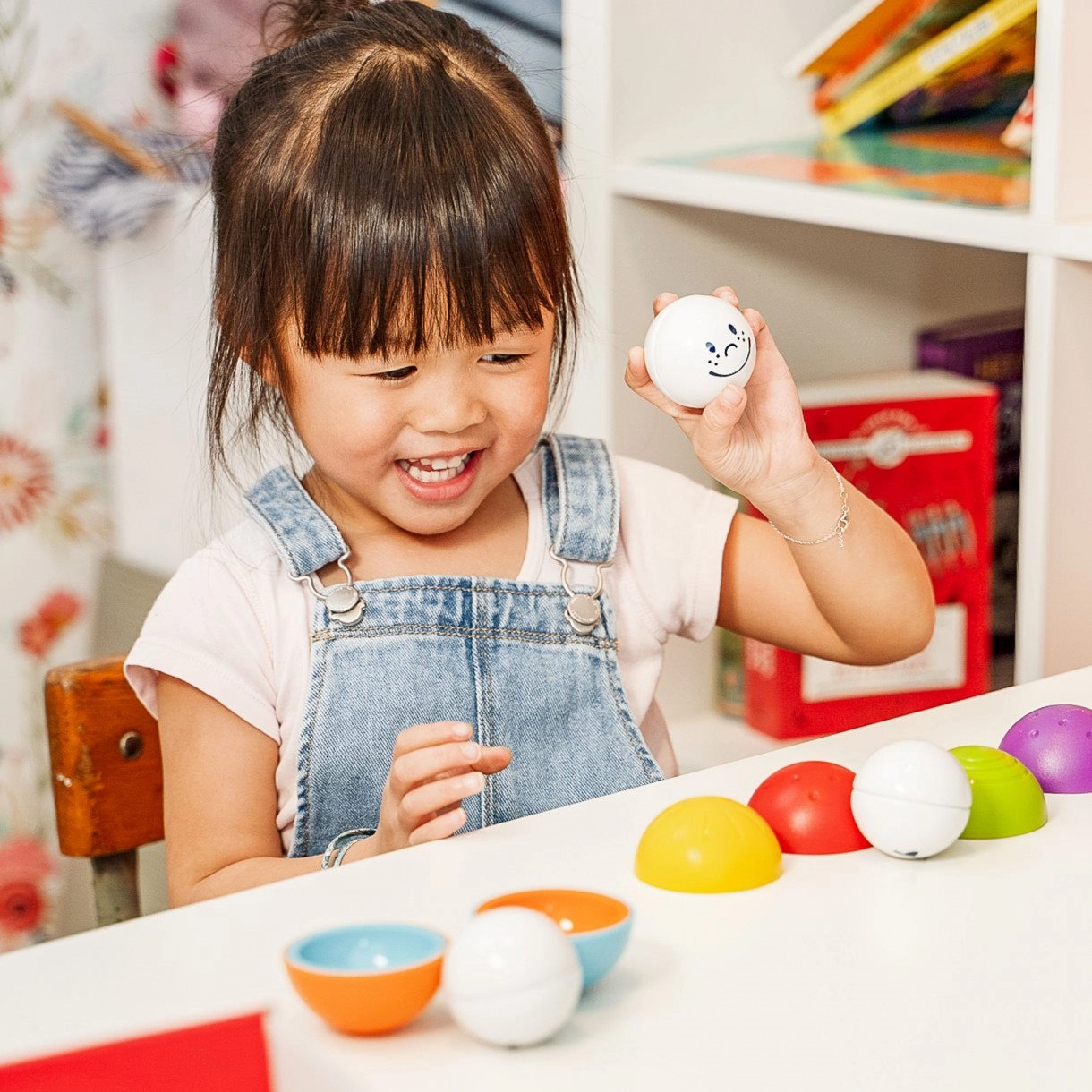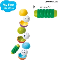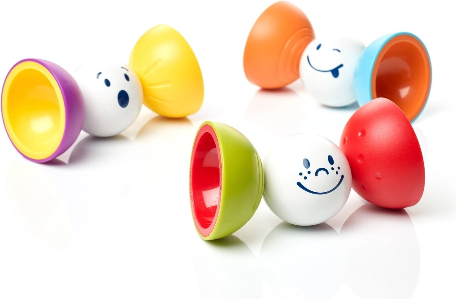 Χαρούμενα προσωπάκια και έντονα χρώματα παρακινούν τα παιδιά στο χτίσιμο, στην ταξινόμηση και στο παιχνίδι κρυφτού με μπαλίτσες.