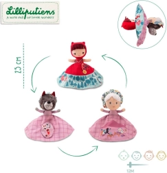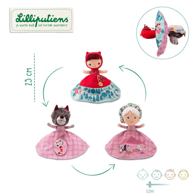 Ερωτευτείτε το κουκλοθέατρο που συνδυάζει τρεις χαρακτήρες σε ένα παιχνίδι - την Κοκκινοσκουφίτσα, τη Γιαγιά και τον Λύκο. Αρκεί να περιστρέψετε την κούκλα και εμφανίζονται διαφορετικοί ήρωες από το αγαπημένο παραμύθι. Η κούκλα είναι κατασκευασμένη από μαλακό υλικό, που επιτρέπει ευχάριστο χειρισμό και προσφέρει ασφαλές παιχνίδι χάρη στη φίνα υφή της επιφάνειας.