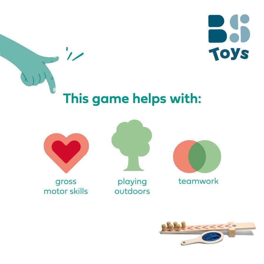 Το Katapult Ninja είναι ένα δυναμικό ξύλινο παιχνίδι που ζωντανεύει κάθε παιδική χαρά και κήπο. Αρκεί να μετρήσετε 1–2–3, να εκτοξεύσετε τους φελλένιους νίντζα στον αέρα και να προσπαθήσετε να τους πιάσετε με το διχτάκι. Τα παιδιά αναπτύσσουν αντίληψη, συντονισμό ματιού–χεριού και ισορροπία, απολαμβάνοντας πολλή ανταγωνιστική αλλά και ομαδική διασκέδαση.