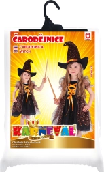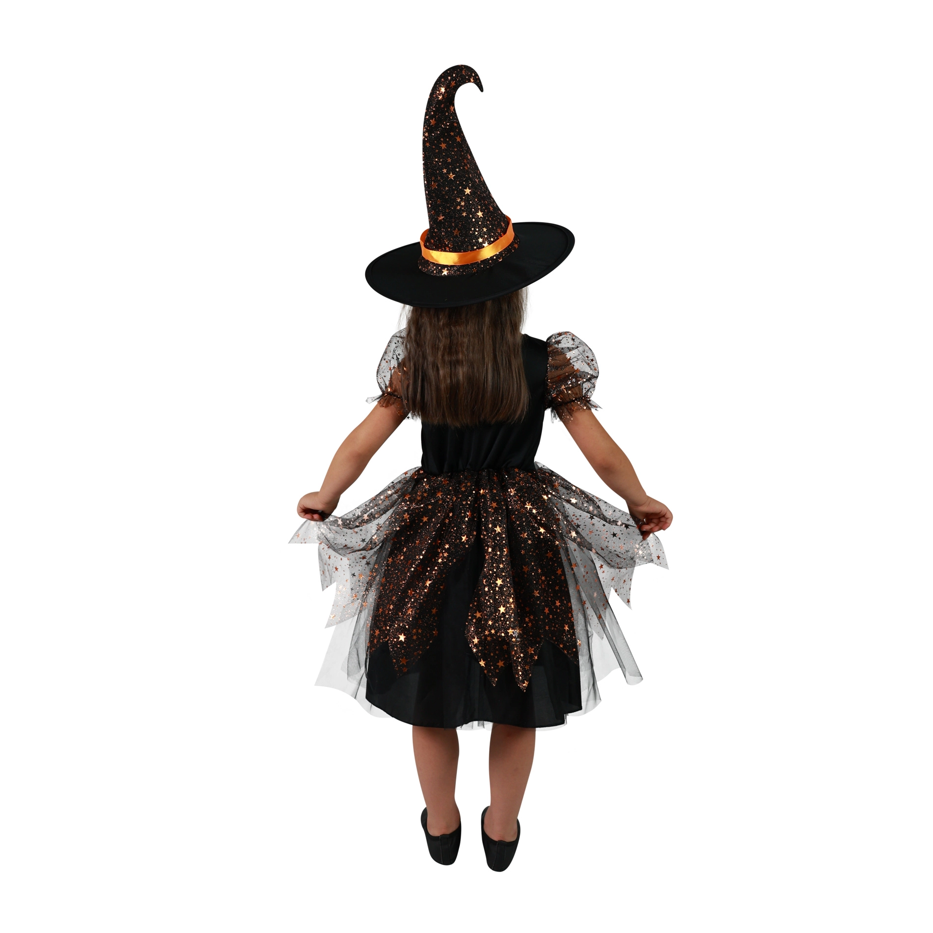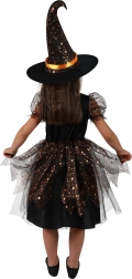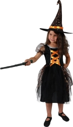 Το φόρεμα είναι πλούσια διακοσμημένο με πορτοκαλί λεπτομέρειες και μεταλλικά αστεράκια, που εντυπωσιάζουν με την πρώτη ματιά. Η στολή περιλαμβάνει επίσης καπέλο μάγισσας, προσδίδοντας αυθεντική εμφάνιση σε όλο το σετ.