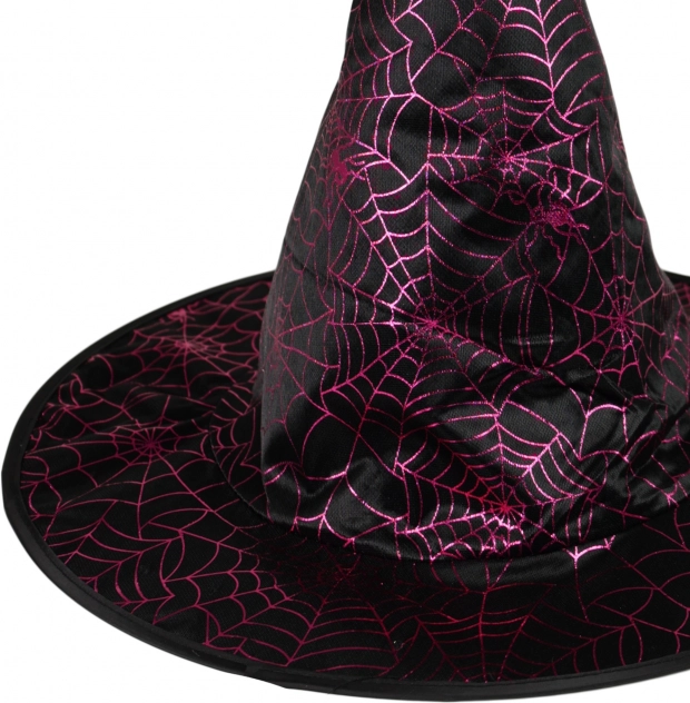 Το καπέλο έχει μαύρο χρώμα με λαμπερούς μοβ ιστούς αράχνης, κάτι που το καθιστά ιδανικό αξεσουάρ για κάθε τρομακτική στολή.