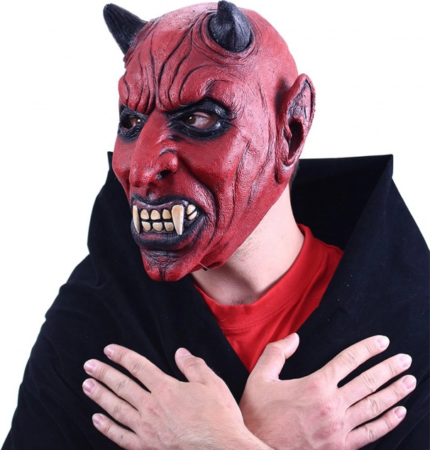 Εξαιρετικά λεπτομερής μάσκα λάτεξ με ρεαλιστικά στοιχεία διαβόλου, συμπεριλαμβανομένων μαύρων κεράτων και κοφτερών δοντιών, που ενισχύουν την τρομακτική αυθεντικότητα.