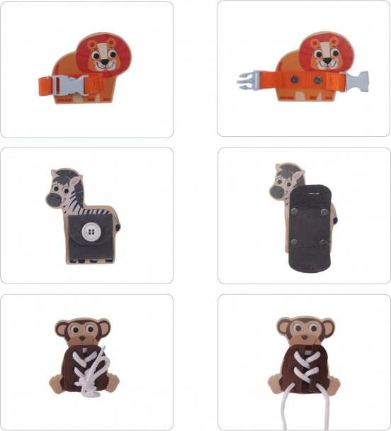 Αυτό το ποιοτικό ξύλινο παζλ Montessori φέρνει στα παιδιά τον πολύχρωμο κόσμο του σαφάρι με αγαπημένα ζωάκια όπως το λιοντάρι, η ζέβρα και η μαϊμού. Κάθε κομμάτι προσφέρει διαφορετική αποστολή – να κουμπώσουν την πόρπη, να δέσουν το κορδόνι ή να κουμπώσουν το κουμπί – ώστε τα παιδιά να εξασκούν φυσικά την αυτονομία και την υπομονή.