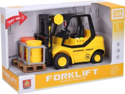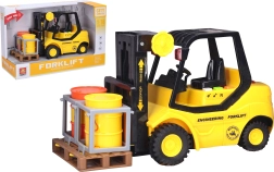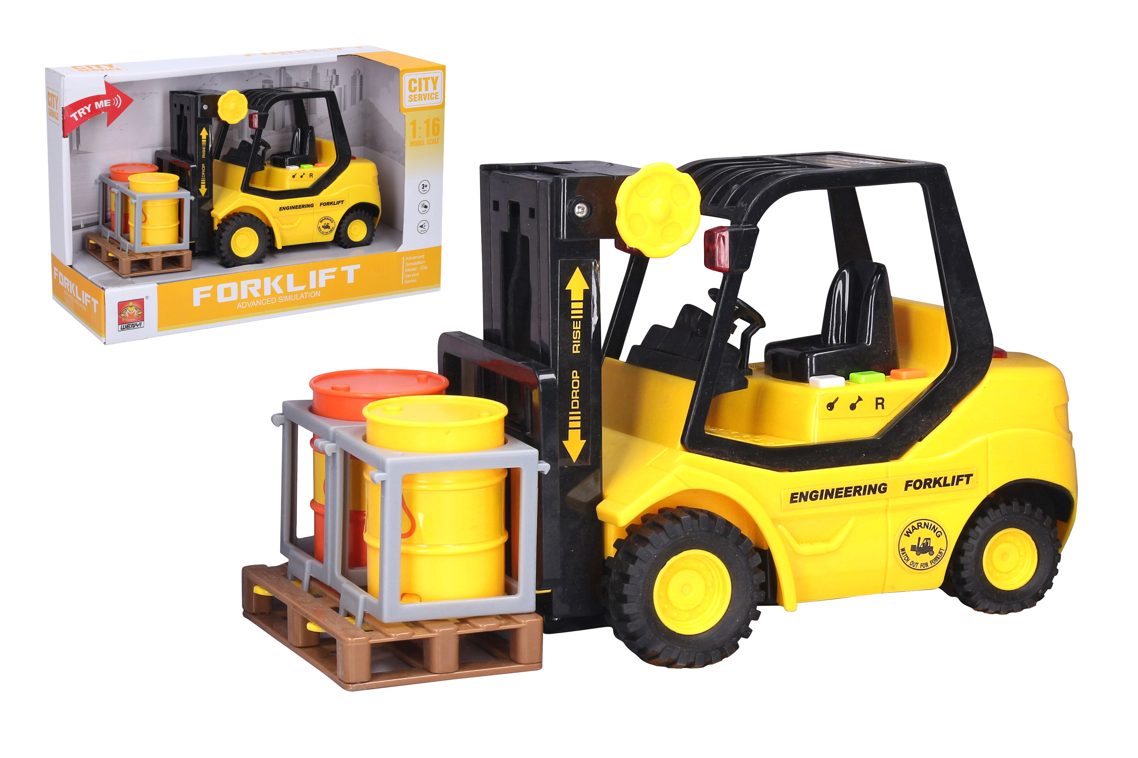 Το κίτρινο-μαύρο περονοφόρο ανυψωτικό είναι το ιδανικό συμπλήρωμα για κάθε παιδική συλλογή παιχνιδιών. Αυτό το μοντέλο είναι σχεδιασμένο για επιδέξιους οδηγούς που θα εκτιμήσουν το κινητό εμπρός τμήμα του, κατάλληλο για την ανύψωση παλετών.