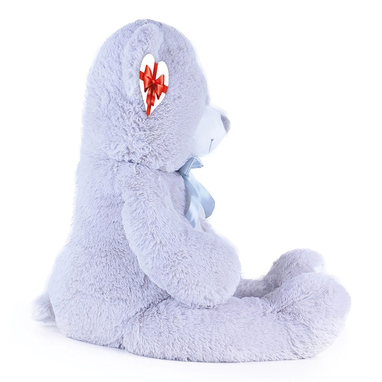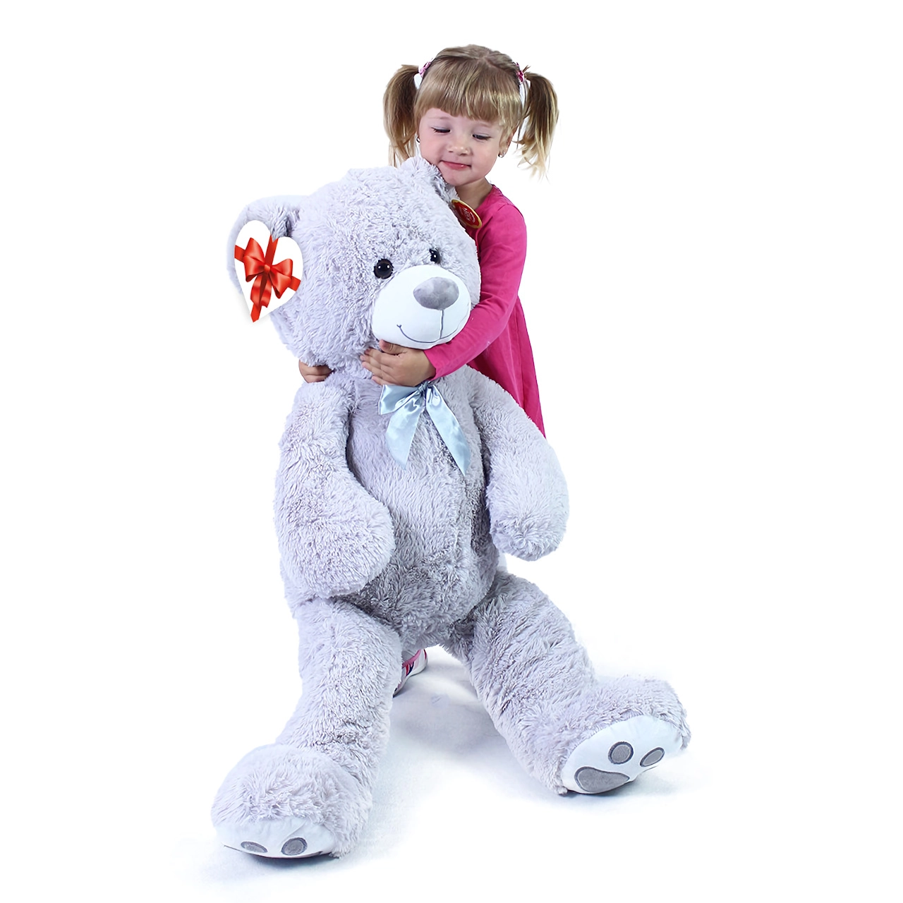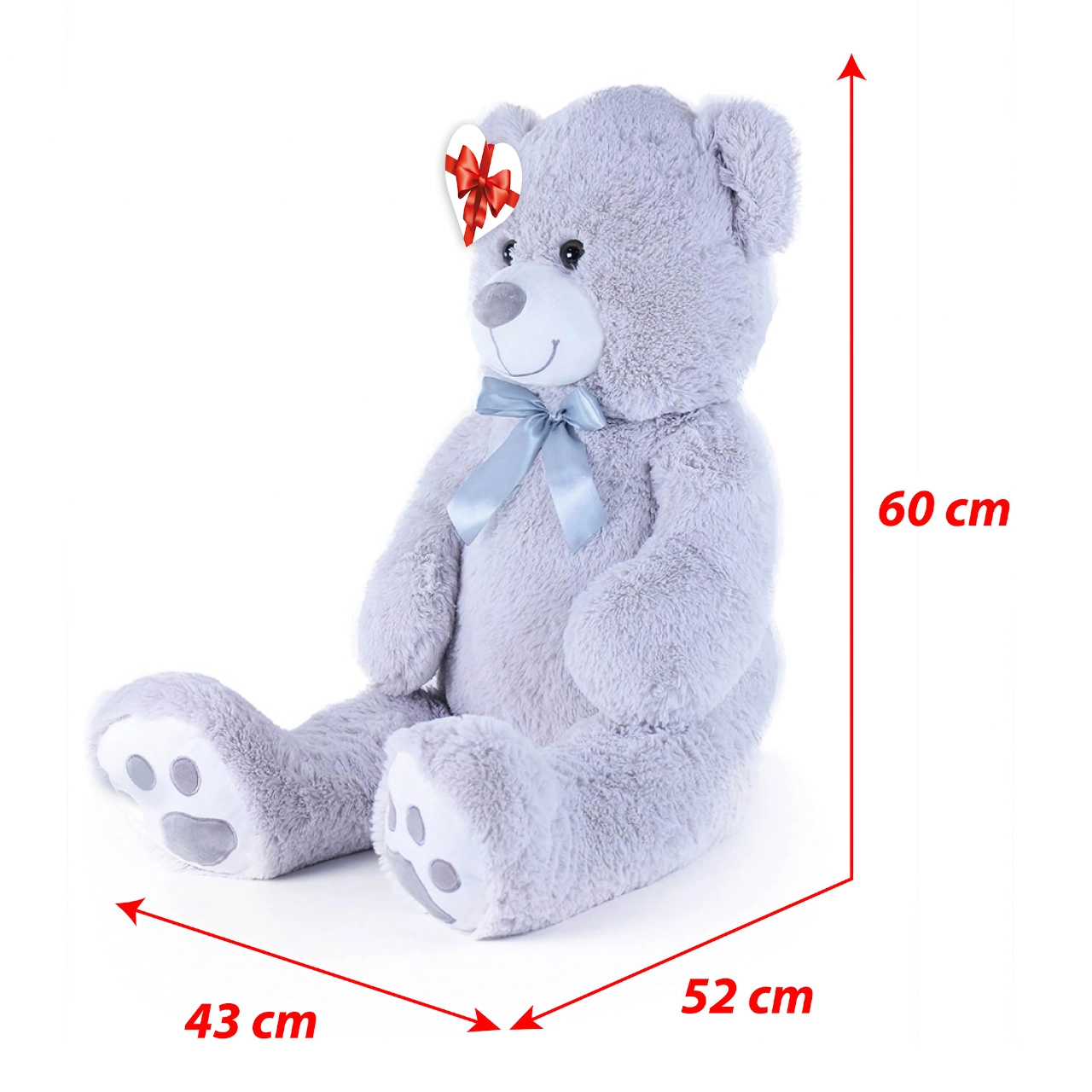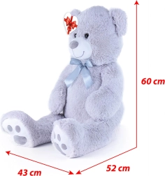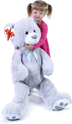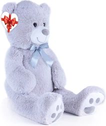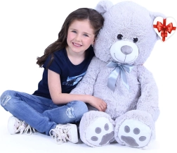 Μεγάλο γκρι λούτρινο αρκουδάκι μήκους περίπου 100 cm που θα σας ενθουσιάσει με την απαλότητα, την αγκαλιάστρα υφή και την ποιοτική κατασκευή του. Η βελούδινη επιφάνεια προσκαλεί σε αγκαλιές, η σατέν κορδέλα προσθέτει κομψή εμφάνιση και η καρδένια ετικέτα επιτρέπει να προσθέσετε προσωπικό μήνυμα – ιδανικό για γενέθλια, γιορτές ή ως διακόσμηση στο παιδικό δωμάτιο.