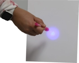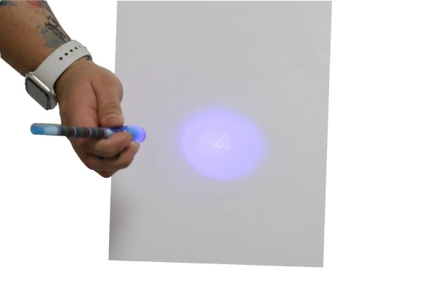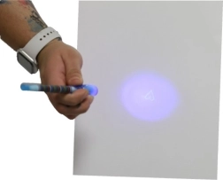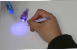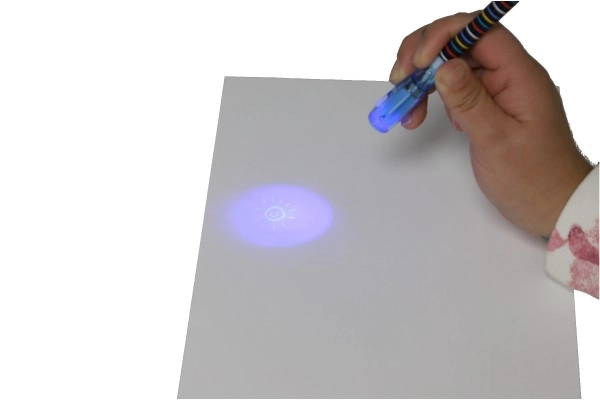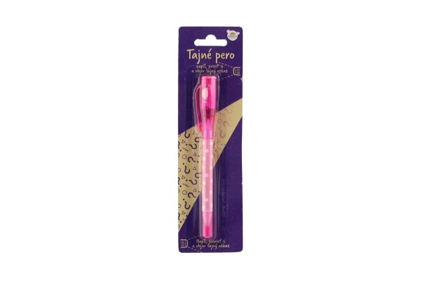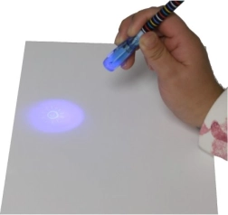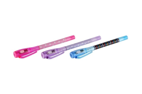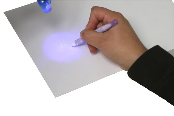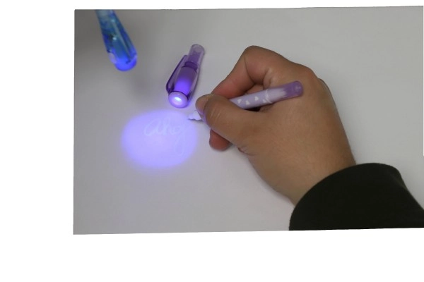 Αόρατο μελάνι ορατό μόνο κάτω από την UV λάμπα στο καπάκι του στυλό. Τέλειο για μυστικά μηνύματα και κατασκοπικά παιχνίδια.