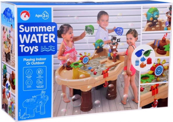 Αυτό το πειρατικό υδάτινο τραπέζι είναι ιδανικό κέντρο παιχνιδιού στον καθαρό αέρα. Τα παιδιά μπορούν να απολαμβάνουν υδάτινα πειράματα, να δημιουργούν πολύχρωμες σαπουνόφουσκες, να πυροβολούν με το υδάτινο κανόνι και να παρατηρούν πώς το νερό κινεί τα οδοντωτά γρανάζια και τα χαριτωμένα ζωάκια. Το τραπέζι ενισχύει τη δημιουργικότητα, την περιέργεια και τον συντονισμό χεριού–ματιού.