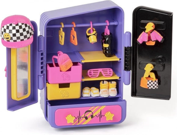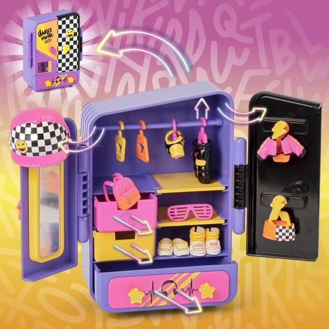 Η πρακτική ντουλάπα με κομψό σχεδιασμό προσφέρει χώρο για την αποθήκευση αξεσουάρ μόδας και ρούχων της κούκλας.