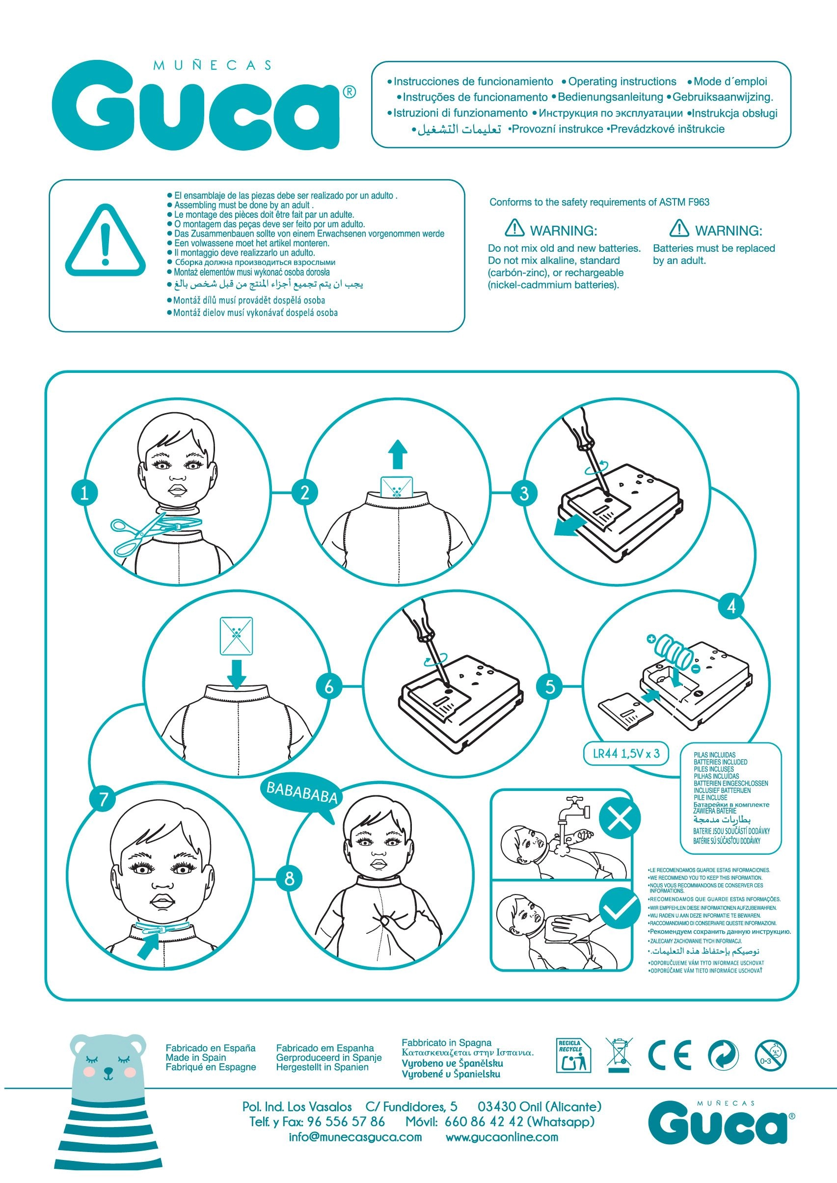 Η κούκλα είναι χειροποίητη στην Ισπανία, γεγονός που εγγυάται υψηλή ποιότητα κατασκευής. Στη συσκευασία περιλαμβάνεται πιπίλα ως αξεσουάρ και μπαταρίες LR44 (3×) με οδηγίες αντικατάστασης. Ιδανικό δώρο για παιδιά από 3 ετών, συσκευασμένο σε κομψή συσκευασία δώρου.