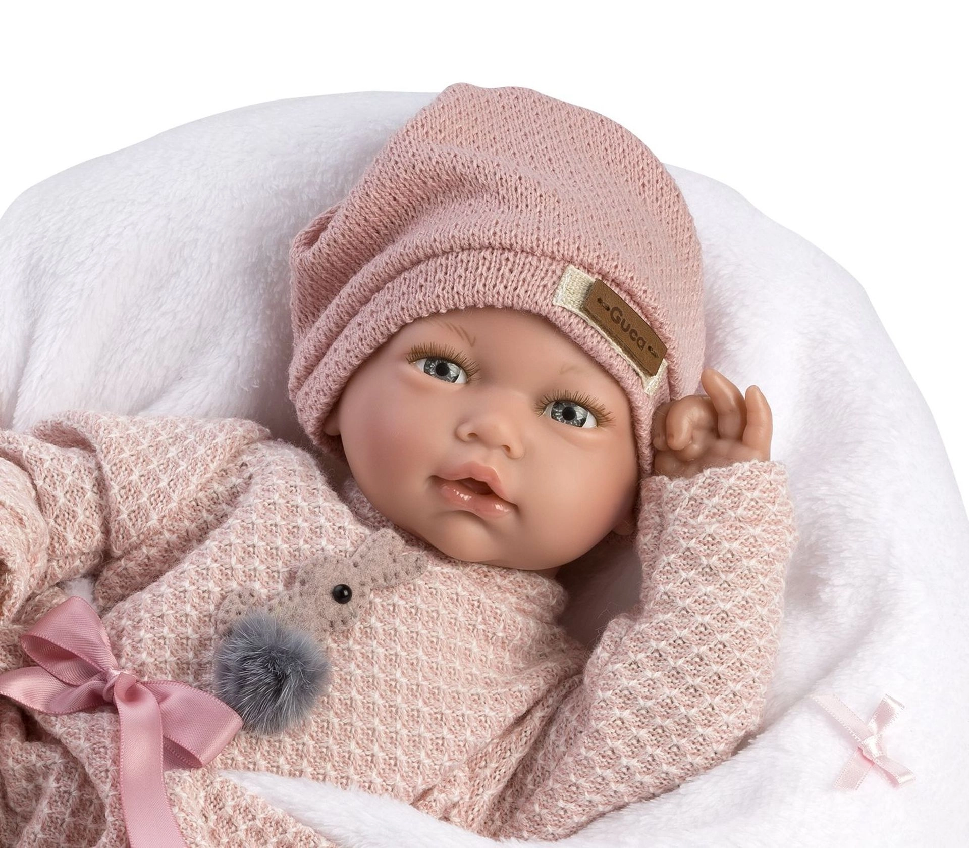 Η χαριτωμένη κούκλα Guca Blanca θα ενθουσιάσει κάθε παιδί με την ρεαλιστική της εμφάνιση και το ευχάριστο, μαλακό υφασμάτινο σωματάκι. Με το πάτημα στο στηθάκι, εκπέμπει ρεαλιστικούς ήχους γελώντας σαν μωρό, έχει αρθρούμενα άκρα με αρθρώσεις και μπορεί να κάθεται μόνη της. Χειροποίητη κατασκευή στην Ισπανία, μέγεθος 38 cm, παρέχεται σε δωροκουτί με μπαταρίες LR44 συμπεριλαμβανομένες.