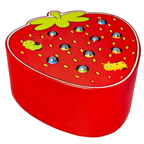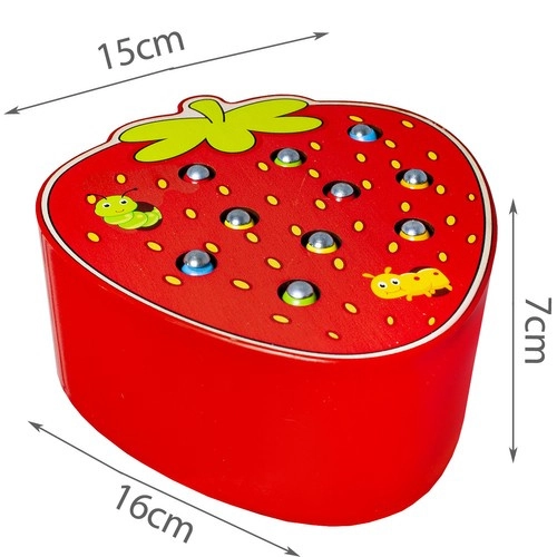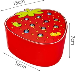 Διασκεδαστικό ξύλινο παιχνίδι σε σχήμα φράουλας, όπου τα παιδιά με τη βοήθεια μαγνητικής ράβδου πιάνουν πολύχρωμα σκουληκάκια κρυμμένα στις τρύπες και τα τοποθετούν ξανά πίσω. Υποστηρίζει λεπτή κινητικότητα, συντονισμό χεριού–ματιού και συγκέντρωση. Η ασφαλής κατασκευή από ποιοτικό ξύλο και τα ζωντανά χρώματα προσκαλούν σε επαναλαμβανόμενο παιχνίδι.