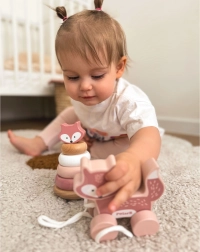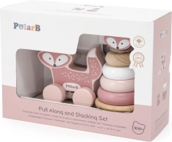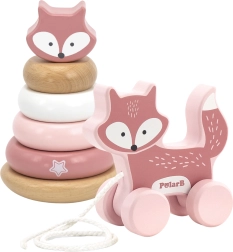 Στο σετ θα βρείτε δύο αγαπημένα παιχνίδια: πύργο στοίβαξης με αλεπού, που μαθαίνει στα παιδιά να βάζουν τους κρίκους κατά μέγεθος και χρώμα, και συρόμενη αλεπού με κορδόνι, που τα παρακινεί στο περπάτημα και την παιχνιδιάρικη κίνηση. Ο συνδυασμός και των δύο υποστηρίζει τη φυσική μάθηση μέσω του παιχνιδιού.