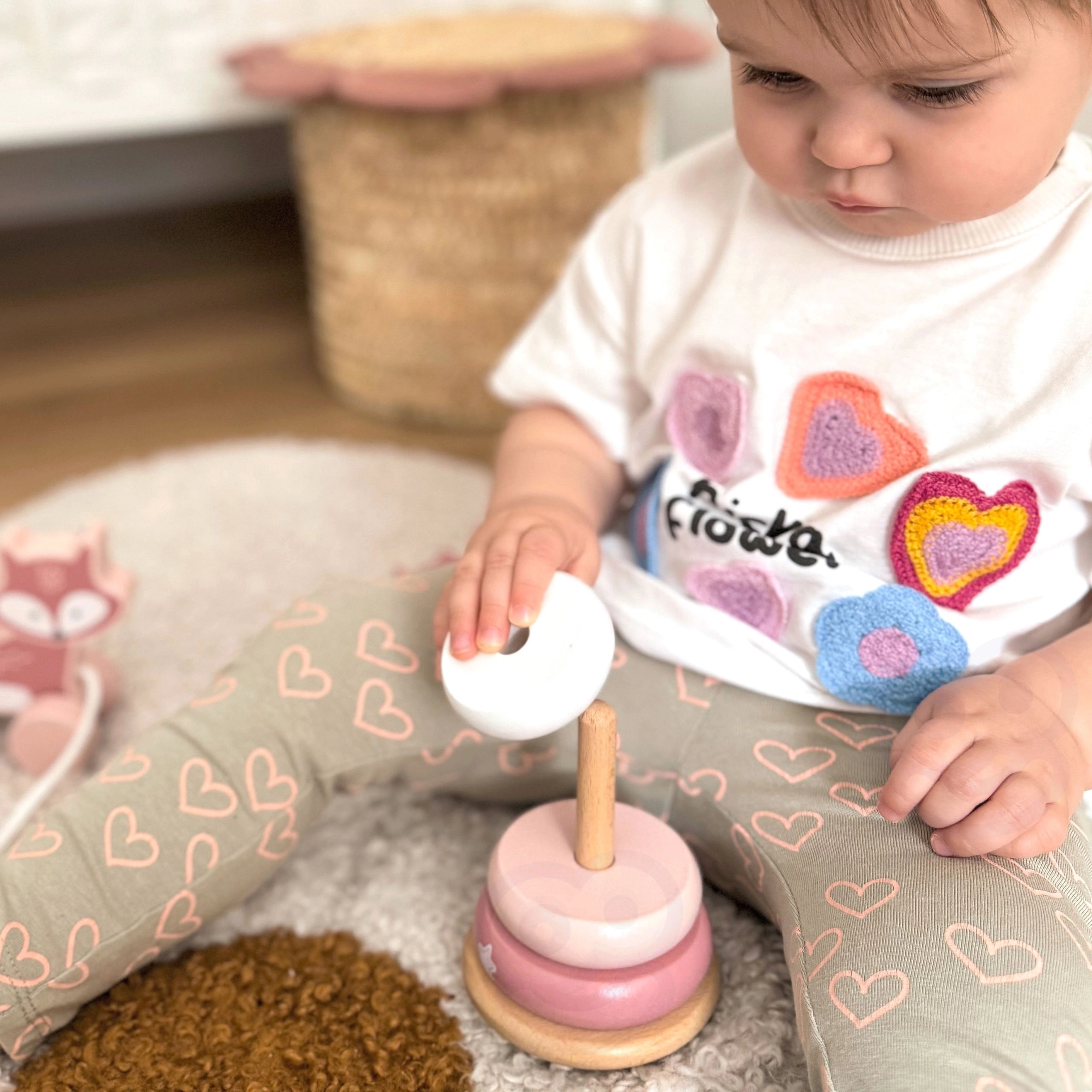 Το στοίβαγμα κρίκων εξασκεί τον συντονισμό χεριού–ματιού και τη δεξιοτεχνία, ενώ το συρόμενο παιχνίδι ενθαρρύνει το περπάτημα και ενισχύει τη σταθερότητα και την ισορροπία.