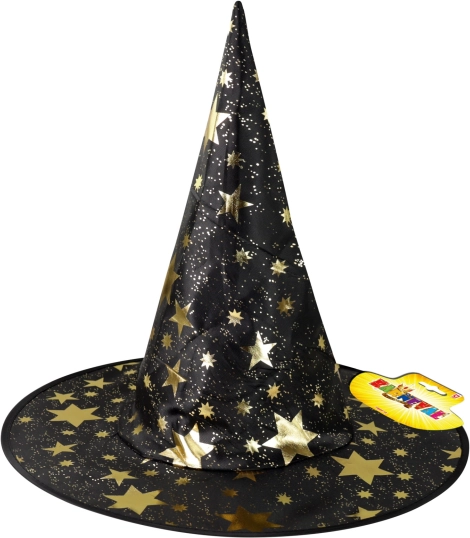 Μεταμορφωθείτε μέσα σε μια στιγμή σε μικρή μάγισσα ή μάγο. Αυτό το μαύρο καπέλο με χρυσά αστέρια είναι το τέλειο συμπλήρωμα για κοστούμι Halloween, παιδικά πάρτι και σχολικά καρναβάλια. Χάρη στο ελαφρύ υλικό φοριέται ευχάριστα και διατηρεί καλά το σχήμα του.