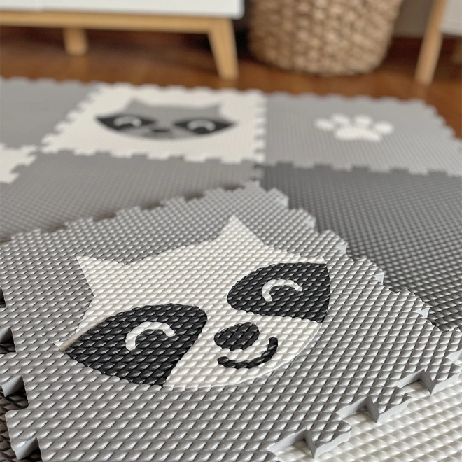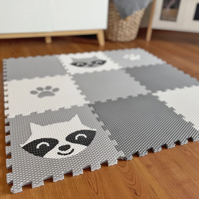 Το παιχνιδόχαρτο ξεχωρίζει με τα χαριτωμένα μοτίβα ρακούν και πατουσών, προσθέτοντας μια παιχνιδιάρικη νότα στον χώρο παιχνιδιού.