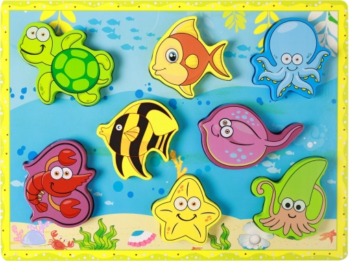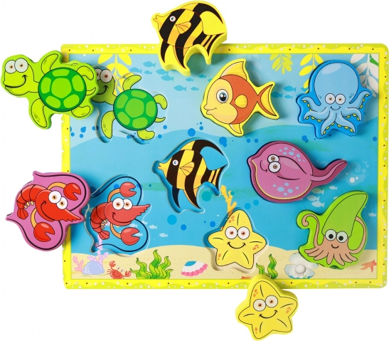 Αυτό το ξύλινο παζλ τοποθέτησης με θέμα τους θαλάσσιους οργανισμούς προσφέρει στα παιδιά χαρά ανακάλυψης σχημάτων και χρωμάτων. Τα κομμάτια έχουν σχεδιαστεί ώστε τα μικρά χεράκια να τα πιάνουν εύκολα και να τα τοποθετούν στα σωστά ανοίγματα, ενισχύοντας φυσικά την επιδεξιότητα και την ακρίβεια των κινήσεων.