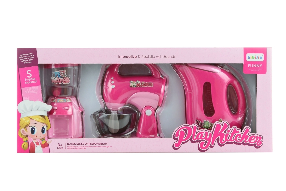 Διαδραστικό σετ παιδικών οικιακών συσκευών κουζίνας για μικρούς σεφ, που προσφέρει ρεαλιστικό παιχνίδι με μίξερ, βραστήρα και χτυπητήρι. Οι ήχοι και τα φωτεινά εφέ ενισχύουν τις παιδικές αισθήσεις και την υπευθυνότητα από 3 ετών.