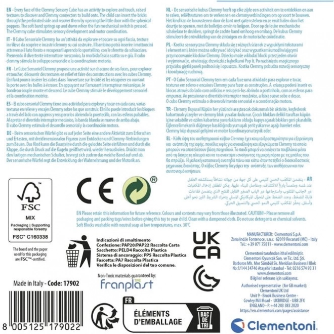 Στη συσκευασία περιλαμβάνονται τέσσερα μαλακά τουβλάκια Clemmy, που μπορούν να εισαχθούν και να αφαιρεθούν εύκολα από τον κύβο μέσω διάτρητου τμήματος ή να στοιβαχθούν στην κορυφή. Ο κύβος είναι μαλακός, ασφαλής και πλήρως πλενόμενος, ιδανικά έως μέγιστο 30°C με ουδέτερο σαπούνι.