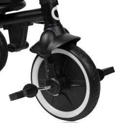 Η ασφάλεια είναι προτεραιότητα: ζώνες ασφαλείας 3 σημείων, προστατευτική μπάρα γύρω από το κάθισμα και κάλυμμα του μπροστινού στεφανιού προστατεύουν το παιδί κατά την οδήγηση. Ο πρακτικός εξοπλισμός περιλαμβάνει αναδίπλωση με ένα κλικ χωρίς εργαλεία, πετάλια με δυνατότητα μετατροπής σε υποπόδια για ξεκούραση των ποδιών και εύκολη μεταφορά χάρη στη ενσωματωμένη χειρολαβή.