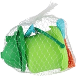 Ελαφρύ πλαστικό σετ σε ζωηρά χρώματα, αποθηκευμένο σε πρακτικό διχτάκι – ιδανικό για την αμμουδιά και τη θάλασσα.