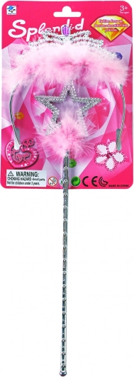 Αποκλειστικό σετ για πριγκίπισσες! Αυτό το στιλάτο σετ περιλαμβάνει εκτυφλωτικό στέμμα με πολύχρωμες πέτρες και σκήπτρο, διακοσμημένο με ροζ φτερά. Εμπλούτισε τη στολή σου με αυτά τα υπέροχα αξεσουάρ.