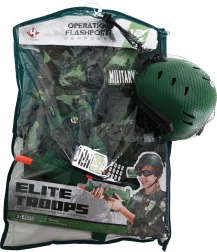 Το σετ περιλαμβάνει ό,τι χρειάζεστε για στρατιωτικό παιχνίδι - γιλέκο, κράνος, όπλα και άλλα αξεσουάρ.