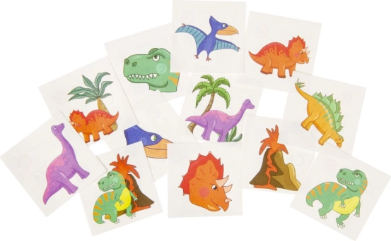 Διασκεδαστικό σετ προσωρινών τατουάζ με θέμα τους δεινόσαυρους που περιλαμβάνει 12 διαφορετικά σχέδια, το καθένα σε ξεχωριστή καρτέλα και με εικονικές οδηγίες για γρήγορη και εύκολη εφαρμογή. Ιδανικό ως μικρή ανταμοιβή, δώρο ή αξεσουάρ για παιδικό πάρτι.