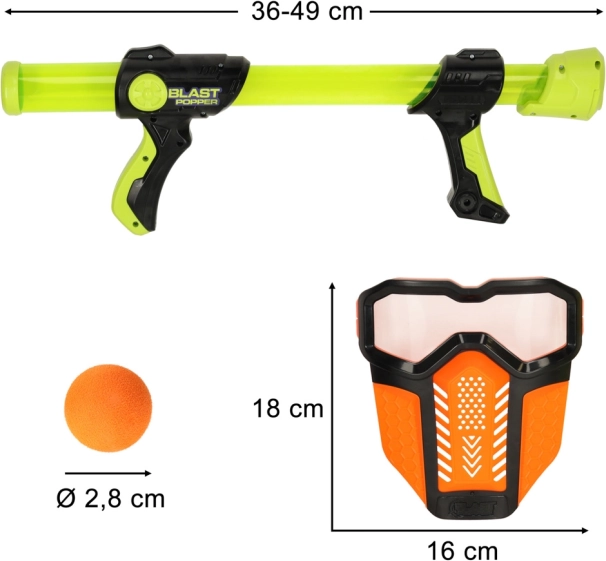 Η μαλακή αφρώδης «σφαίρα» είναι φιλική και το ζευγάρι προστατευτικών μασκών αυξάνει την ασφάλεια και την άνεση στο παιχνίδι. Τα blaster λειτουργούν χωρίς μπαταρίες – η βολή γίνεται με μετακίνηση του πίσω μέρους της κάννης, ώστε το παιχνίδι να είναι πάντα έτοιμο όπου κι αν βρίσκεστε.