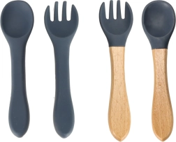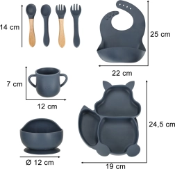 Πλήρες σετ παιδικών σκευών σιλικόνης 9 τεμαχίων με σχέδιο σκίουρο σε σκούρο μπλε χρώμα. Περιλαμβάνει χωριστό πιάτο, μπολ με βεντούζα, ποτηράκι με δύο καπάκια και καλαμάκι, σαλιάρα και μαλακά μαχαιροπίρουνα. Είναι χωρίς BPA, ανθεκτικό και πλένεται εύκολα στο πλυντήριο πιάτων – ιδανικό για τα πρώτα βήματα αυτόνομης σίτισης με αντιολισθητικές βεντούζες.