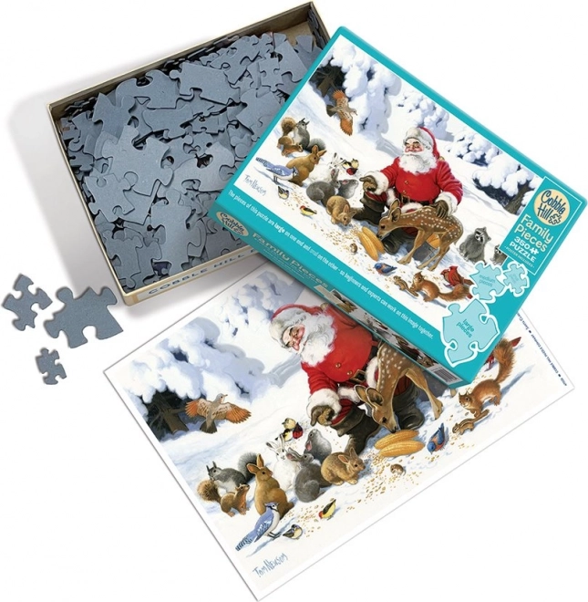 Απολαύστε το κοινό συναρμολόγημα με το οικογενειακό παζλ COBBLE HILL με θέμα τον Άη Βασίλη και τους ζωικούς του φίλους. Η συσκευασία περιλαμβάνει κομμάτια σε τρεις μεγέθη – μικρά, μεσαία και μεγάλα – ώστε να είναι ιδανικό για παιδιά, γονείς και παππούδες/γιαγιάδες. Η μη τυποποιημένη κοπή με πρωτότυπα σχήματα κομματιών προσφέρει διασκεδαστική πρόκληση και η ολοκληρωμένη εικόνα έχει διαστάσεις περίπου 67,6 × 48,9 εκ..