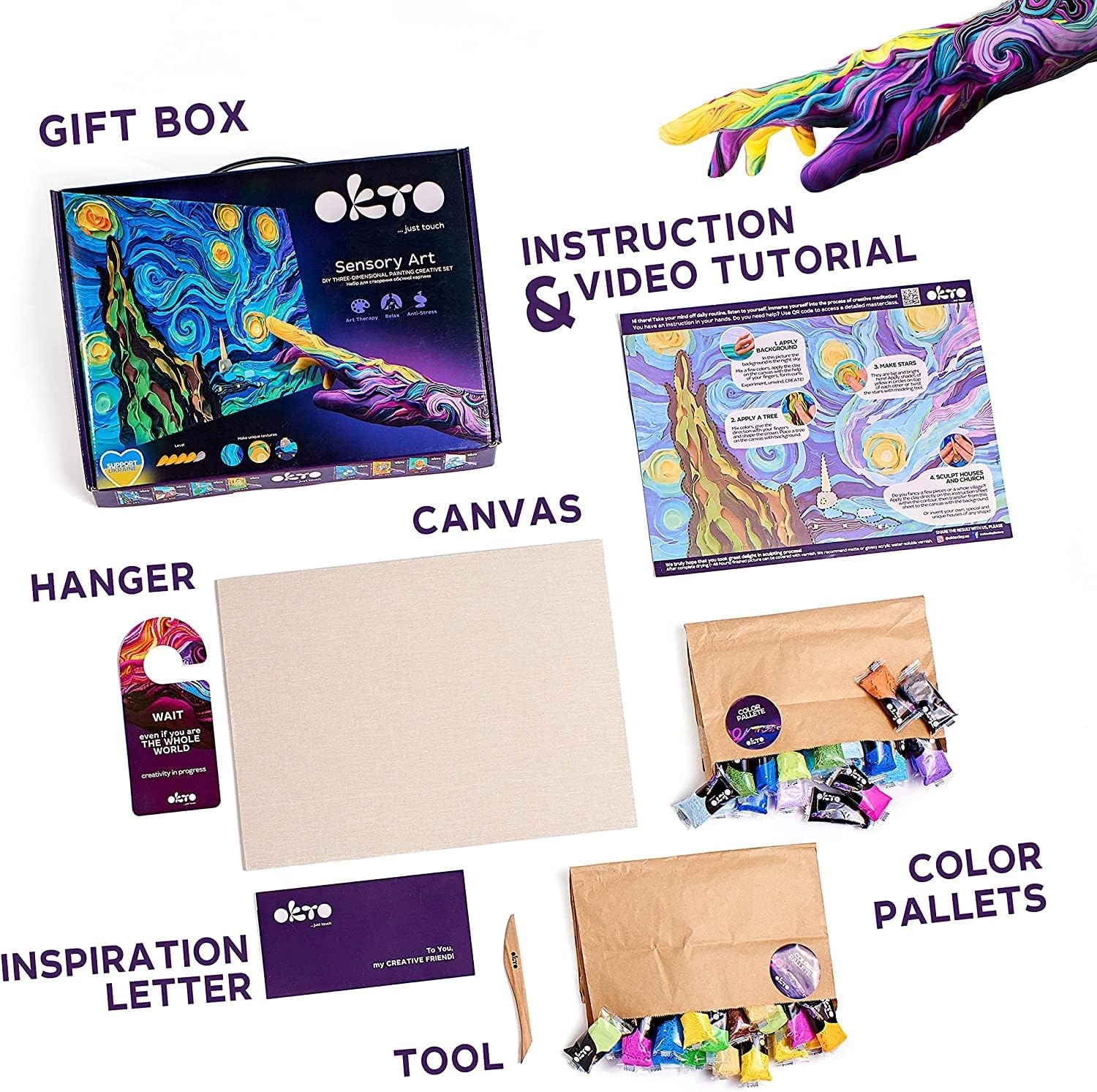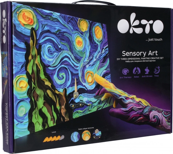 Ανακαλύψτε μια δημιουργική εμπειρία με το σετ τέχνης Okto Sensoty Art – Αστερόβραδο, εμπνευσμένο από το αριστούργημα του Βίνσεντ βαν Γκογκ. Χάρη στη σκληρυνόμενη στον αέρα πάστα (air clay) και την τεχνική ζωγραφικής με τα δάχτυλα θα δημιουργήσετε ένα ανάγλυφο έργο με επίπεδο δυσκολίας 4/5. Ιδανικό για ανάπτυξη δημιουργικότητας και χαλάρωση, με καμβά διαστάσεων 30 × 40 cm και όλα όσα χρειάζεστε στη συσκευασία.